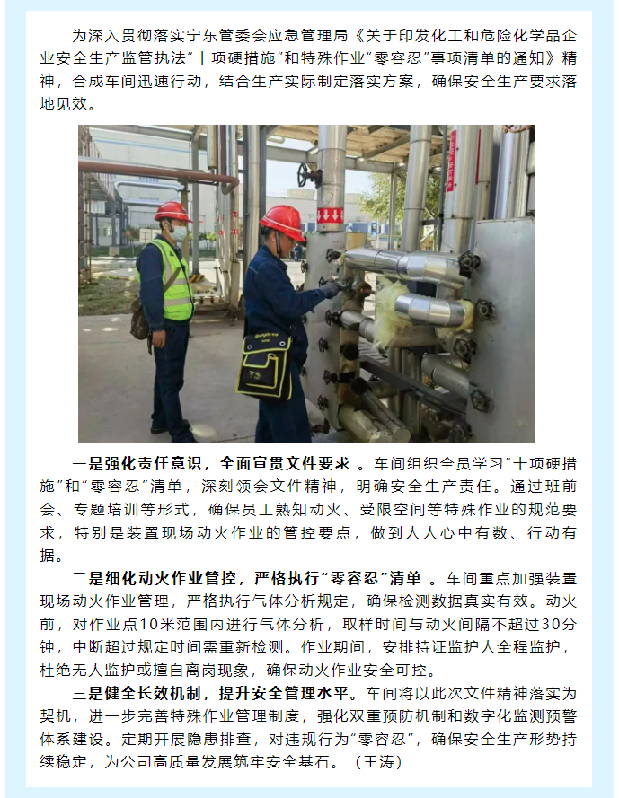 合成車間多措并舉全面落實安全生產監(jiān)管執(zhí)法要求