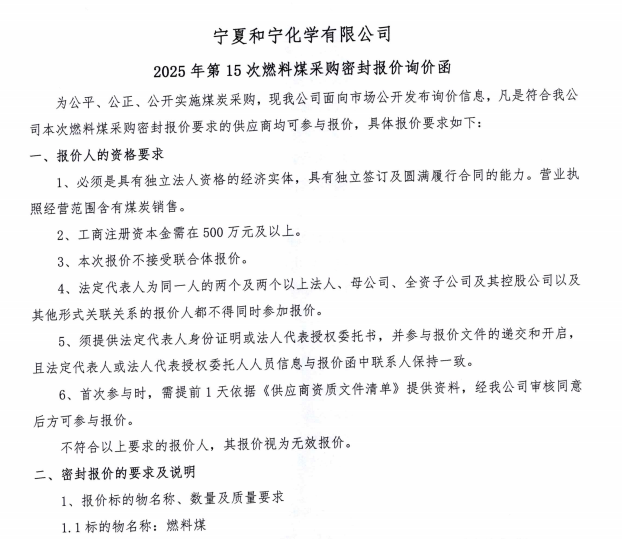 寧夏和寧化學(xué)有限公司2025年第15次燃料煤采購密封報價詢價函.pdf