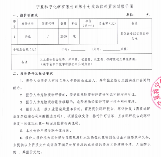 寧夏和寧化學有限公司第十七批雜鹽處置密封報價函.pdf [全文]